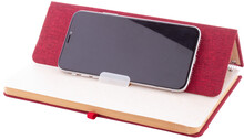Spirálový blok A5 s deskami potaženými polyesterem RPET s plastovým držákem na mobil a tablet z pšeničné slámy. Se 70 linkovanými listy z recyklovaného kraftového papíru, gumičkou a držákem na pero.