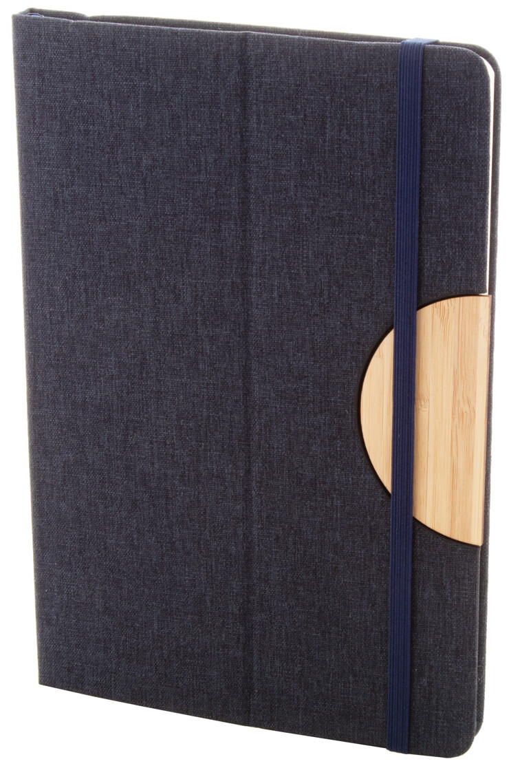 Blok A5 s deskami potaženými polyesterem RPET s bambusovou vložkou a funkcí držáku na mobil. S 80 linkovanými listy z recyklovaného papíru, záložkou a gumičkou.