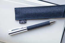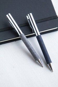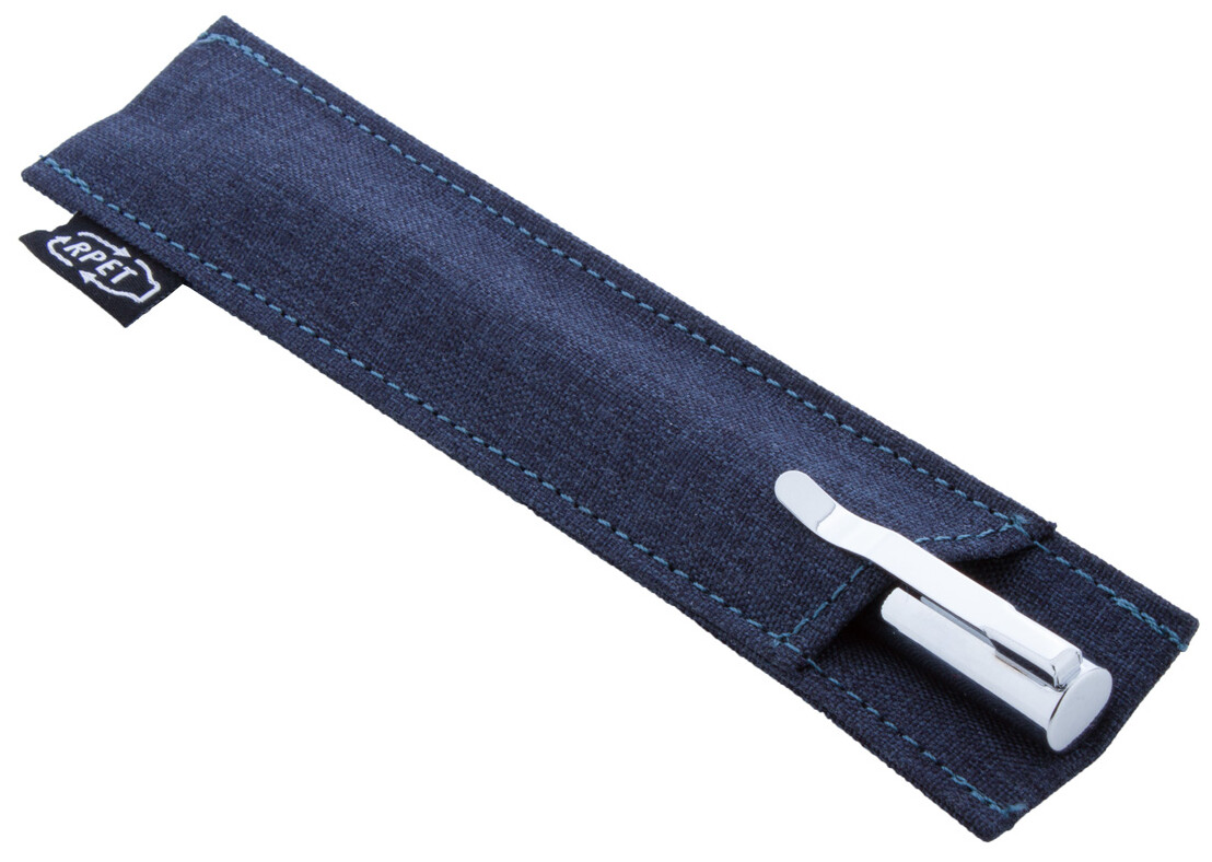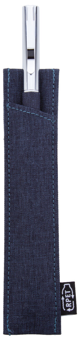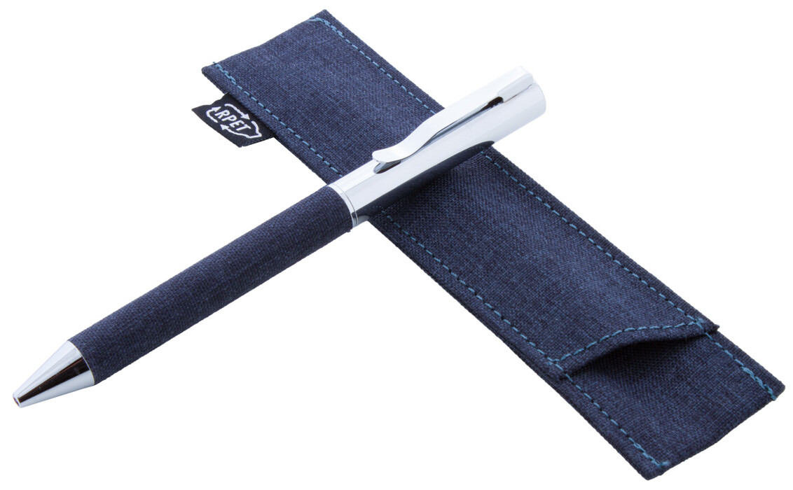 Kovové kuličkové pero s twist otočným mechanismem potažené polyesterem RPET. V odpovídajícím polyesterovém pouzdře RPET. S modrou náplní.