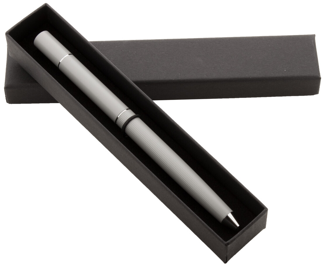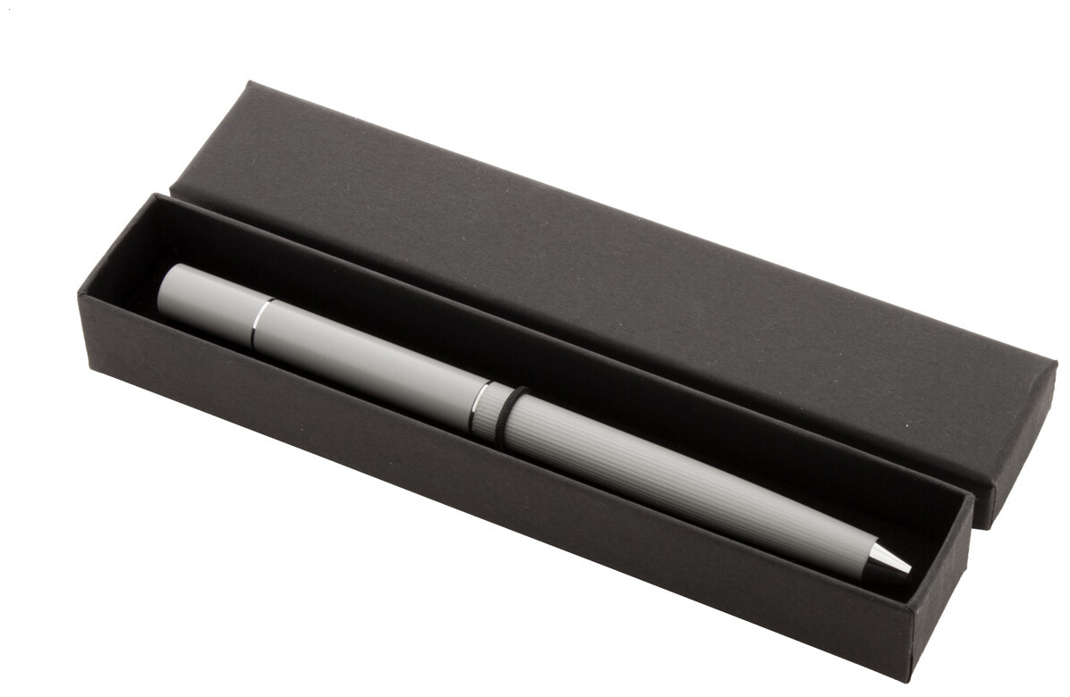 Kovové kuličkové pero 2v1 a pero bez inkoustu v černé dárkové krabičce. S modrou náplní a špičkou z kovové slitiny, která oxiduje papír.