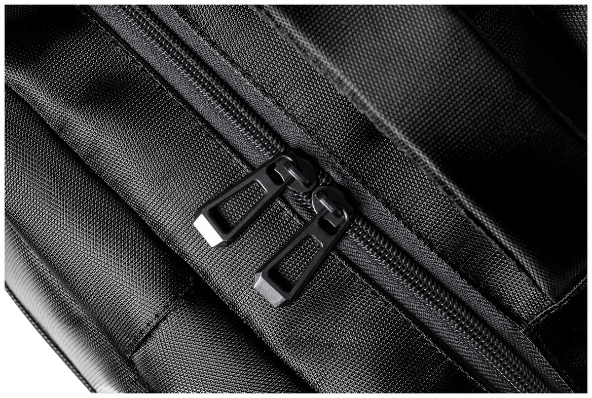 Batoh RNYLON s přihrádkami na zip, bočními kapsami ze síťoviny, polstrovanou kapsou na notebook (15"), popruhem na vozík, polstrovanými zády a ramenními popruhy. 420D recyklovaný nylon s výrazným štítkem RNYLON.