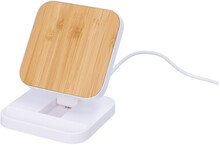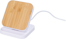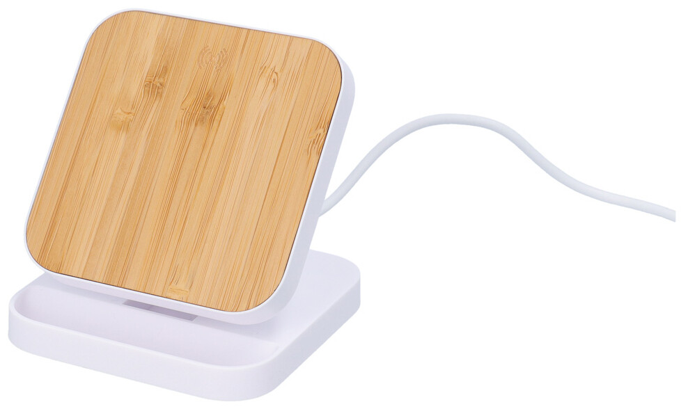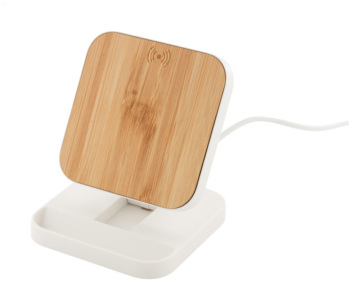 Recyklovaný stojánek na mobil z ABS s bambusovou vestavěnou bezdrátovou rychlonabíječkou (15W). Včetně USB nabíjecího kabelu.