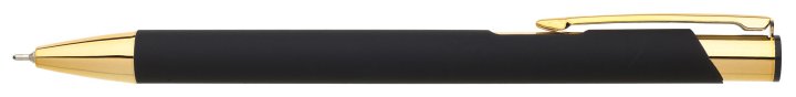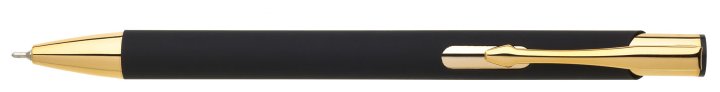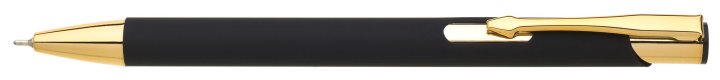 Kovová propiska s pogumovaným povrchem a zlatými doplňky, s efektem laseru v lesklé zlaté barvě. Náplň velkoobsahová, semigelová.