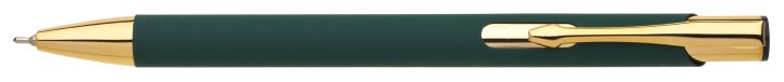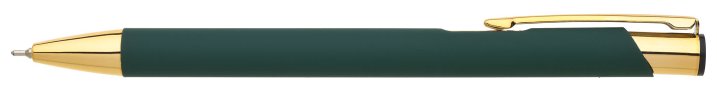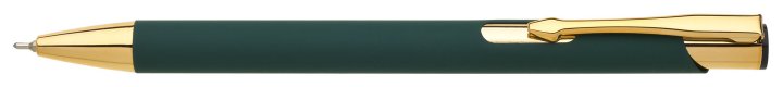 Kovová propiska s pogumovaným povrchem a zlatými doplňky, s efektem laseru v lesklé zlaté barvě. Náplň velkoobsahová semigelová.
