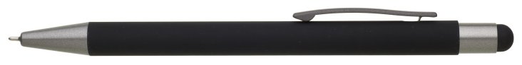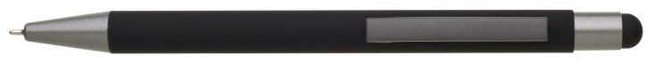 Kovová propiska s hnědo-černými doplňky, pogumovaným povrchem a touch koncem v barvě těla. Náplň semigel s mikrohrotem.