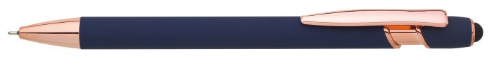 Kovová propiska se soft povrchem, touch koncovkou a doplňky v růžovo-zlaté barvě. Laserované logo je lesklé, růžovo-zlaté. Náplň semigelová, modře píšící.