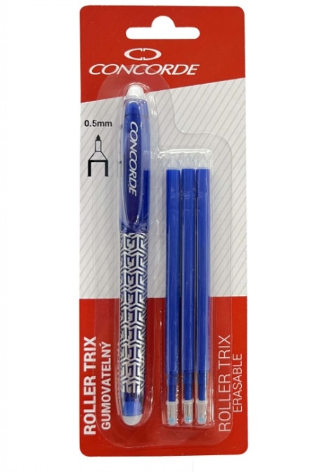 Gumovatelný inkoustový roller, který umí opravit vaše omyly. Napsaný text lze vymazat a následně přepsat. K vymazání slouží 2 koncovky z elastomeru umístěné na konci těla tužky a na víčku. Šíře hrotu 0,5 mm je vhodná pro psaní ve škole i v kanceláři. Pogumovaný trojboký úchop pro správné držení. Barva inkoustu odpovídá barvě těla. Blistrové balení je včetně 3 ks náhradních náplní Trix.