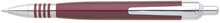 Červené zužující se metalické tělo se čtyřmi dekorativními proužky na úchopu, stříbrné doplňky. Náplň velkoobsahová, modře píšící.