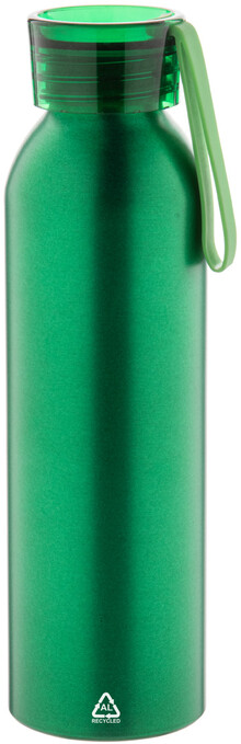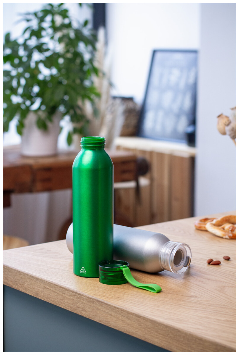 Láhev z recyklovaného hliníku s víčkem v odpovídající barvě a silikonovým popruhem, 600 ml.