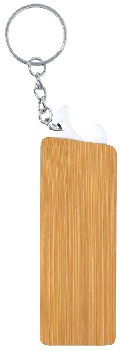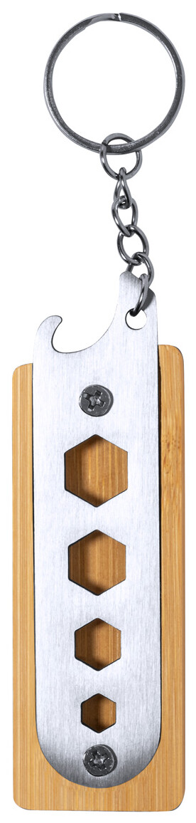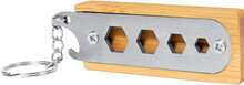 Přívěšek na klíče z bambusu a nerezové oceli s otvírákem na láhve a 4 šestihrannými otvory pro klíče.
