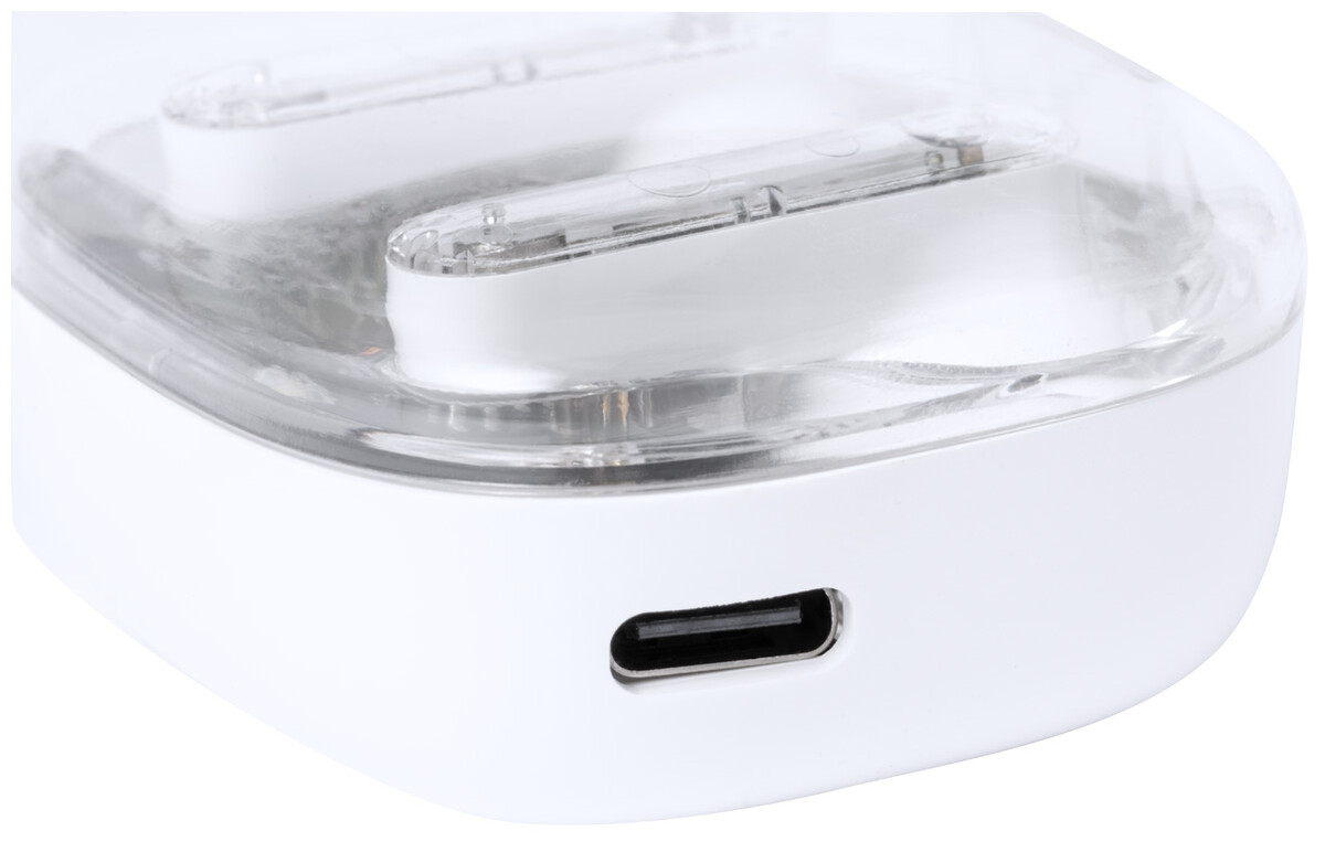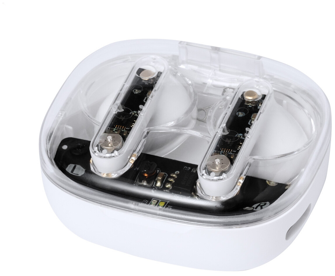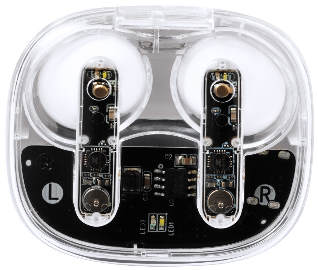 Poloprůhledná, skutečně bezdrátová stereofonní sluchátka (TWS) s viditelnými elektronickými součástmi a funkcí hands-free volání. V poloprůhledném plastovém pouzdře s nabíječkou. Včetně nabíjecího kabelu USB.