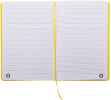 Blok potažený recyklovanou PU kůží se 100 linkovanými listy z recyklovaného papíru. Se záložkou v odpovídající barvě a gumičkou. Velikost A5.