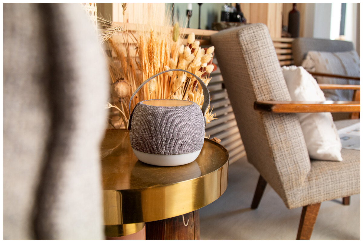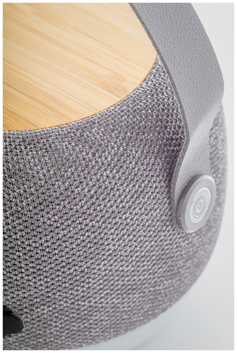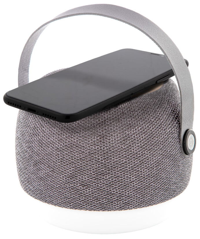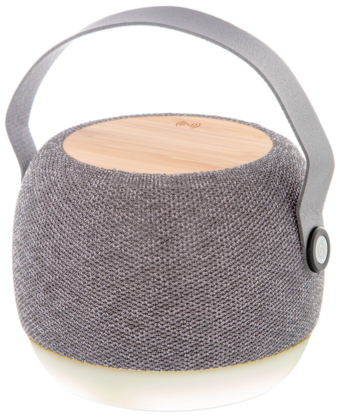 Bezdrátový reproduktor v pouzdře z recyklovaného ABS potaženém tkaninou RPET s LED světlem ve spodní části a bezdrátovou rychlonabíječkou s bambusovou deskou (15 W) v horní části. S koženým řemínkem na přenášení z PU kůže, funkcí hands-free volání a vestavěnou dobíjecí baterií (1200 mAh). Včetně nabíjecího kabelu USB.