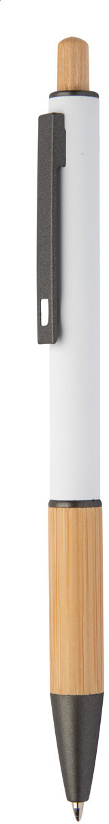 Kuličkové pero z recyklovaného hliníku s bambusovým úchopem a tlačítkem, pogumovaným tělem a kovovými částmi. S modrou náplní.