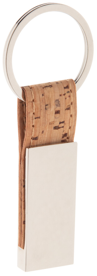 Obdélníkový kovový přívěsek na klíče s přírodním korkem a řemínkem z PU kůže. V kraftové papírové krabici.