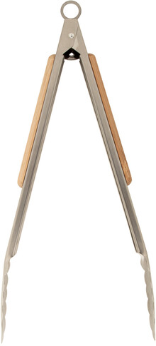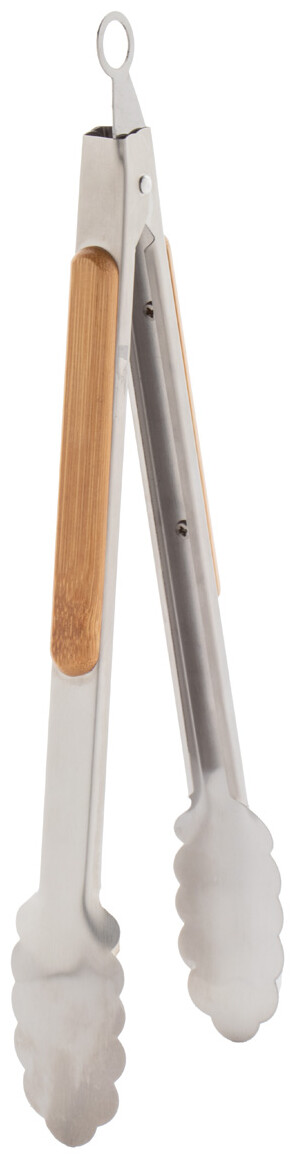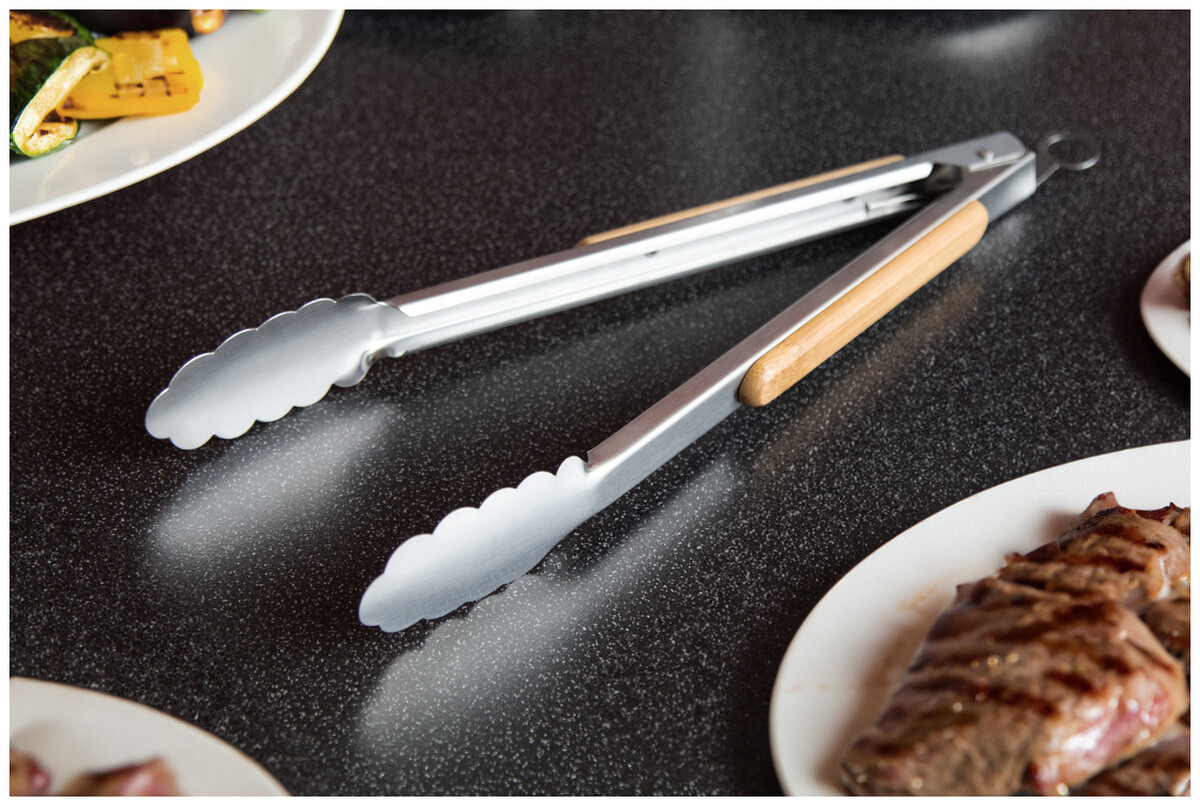 Nerezové kleště na grilování s bambusovými držadly a uzamykacím mechanismem.