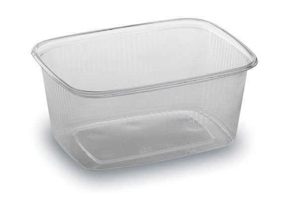 Klasická průhledná hranatá miska, vhodná k prodeji salátů, a dalších potravin.