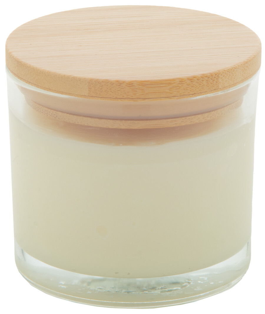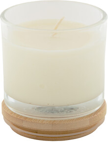 Rostlinná vosková svíčka s vůní vanilky ve skleněném držáku s bambusovým víčkem. S 95 gramy vosku. V kraftové papírové krabici.
