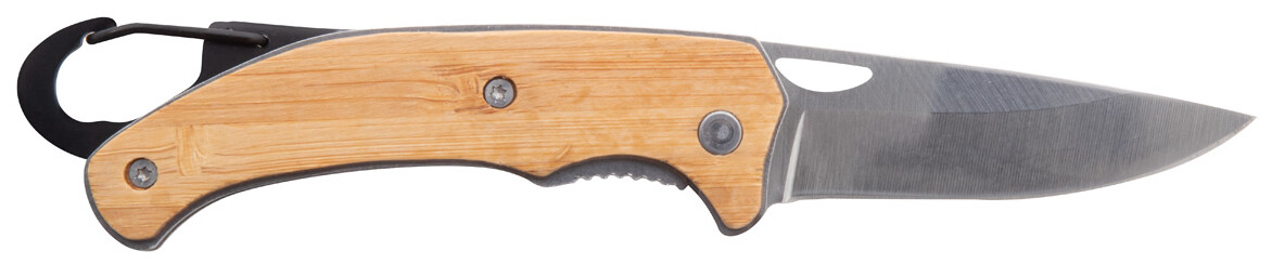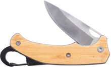 Kapesní nůž z nerezové oceli s bambusovou rukojetí a karabinou. S bezpečnostním zámkem.