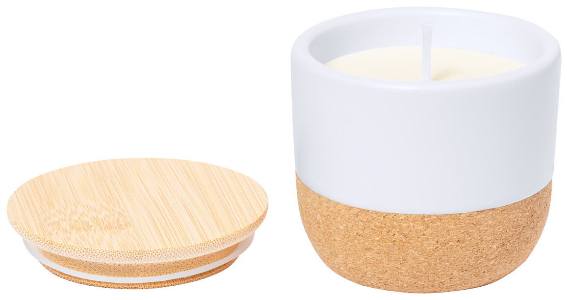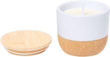 Rostlinná vosková svíčka s vůní vanilky v keramickém stojánku se dnem z přírodního korku a bambusovým víčkem.
