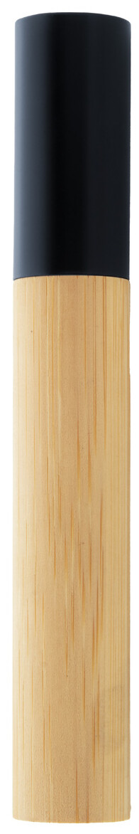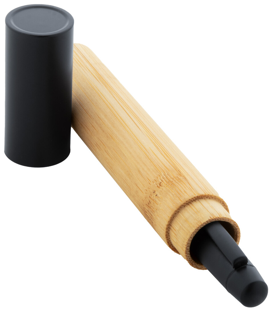 Elegantní černé kovové kuličkové pero s bambusovým tělem a černými částmi. V pouzdře z bambusové tuby s černým uzávěrem. S modrou náplní.