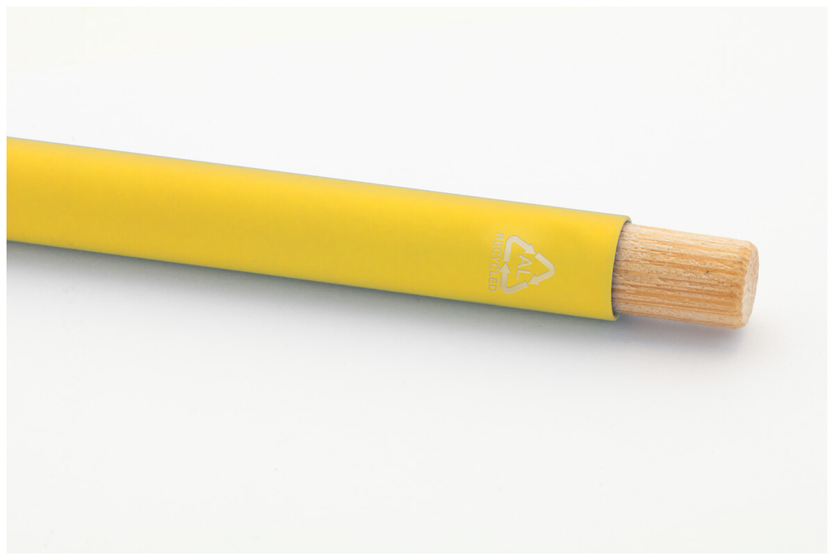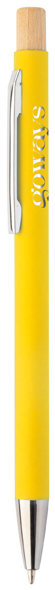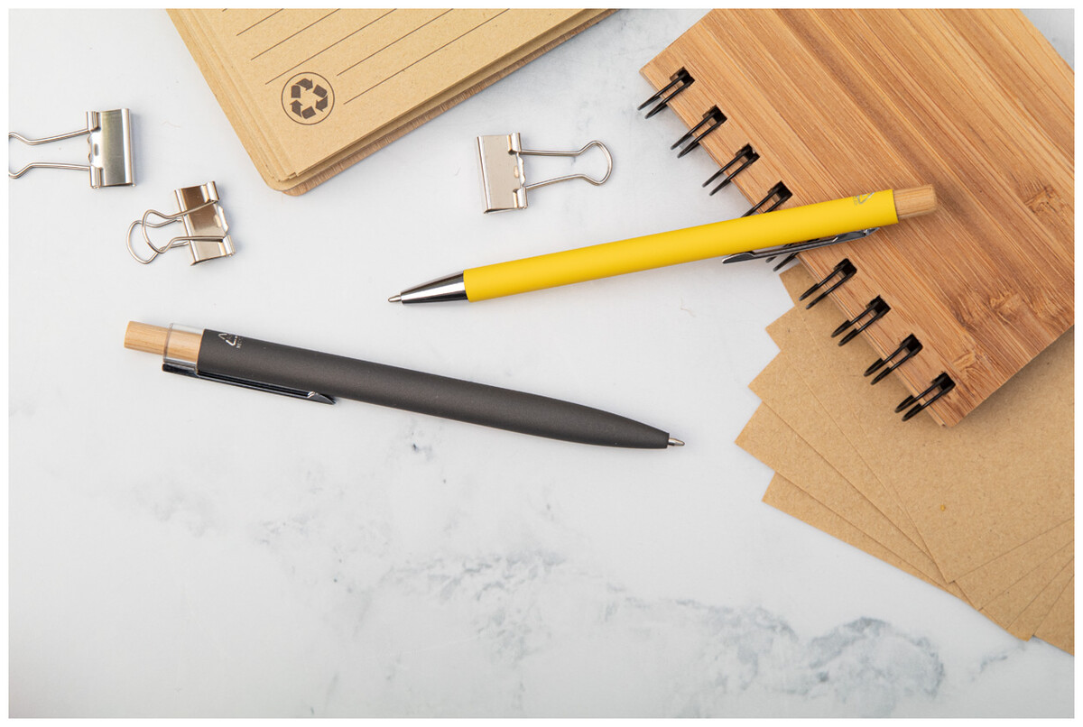 Kuličkové pero z recyklovaného hliníku s pogumovaným povrchem a bambusovým tlačítkem a chromovými detaily. Se speciální vrstvou pro zrcadlové laserové gravírování. S modrou náplní.