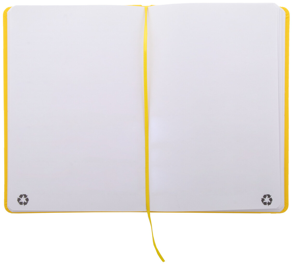 Blok A5 z recyklované PU kůže se 100 čistými listy z recyklovaného papíru. Se záložkou v odpovídající barvě a gumičkou.