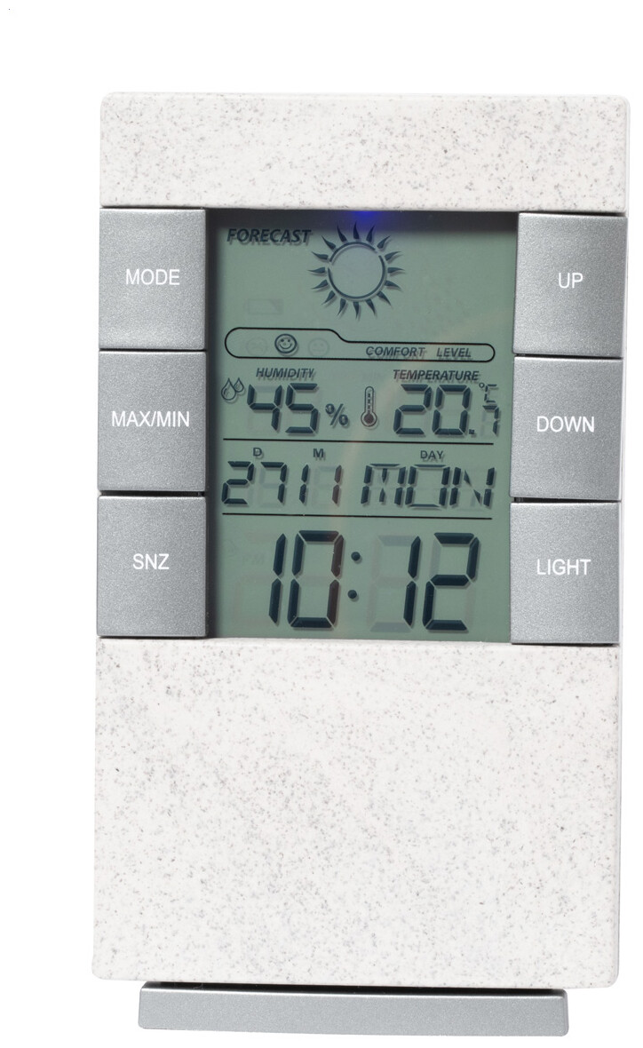 Ekologické plastové digitální hodiny a meteostanice z pšeničné slámy s teploměrem a ukazatelem vlhkosti. Funguje na 2 baterie AAA, bez baterií.