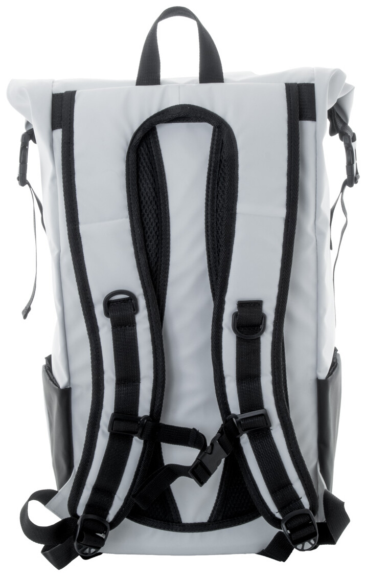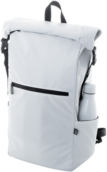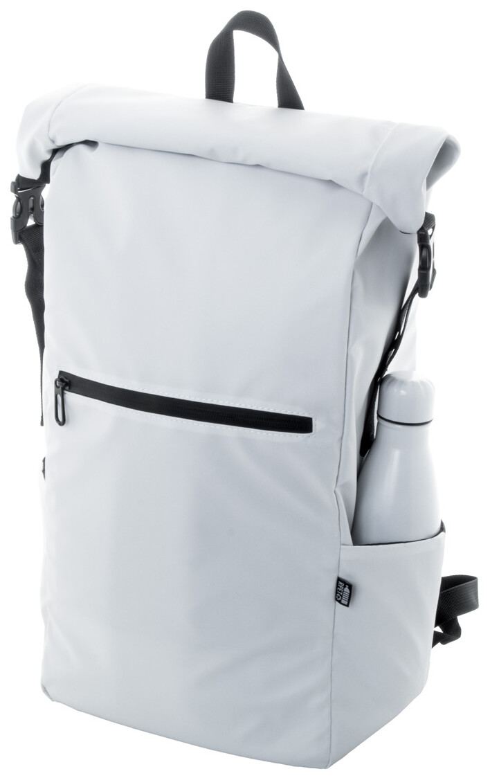 Vodotěsný rolovací batoh z RPET se zapínáním na přezku a suchý zip, polstrovaná přihrádka na notebook (16") a tablet (10"), přední kapsa na zip, boční kapsy, polstrovaná záda a ramenní popruhy. Polyester 600D RPET potažený PU, s výrazným štítkem RPET.