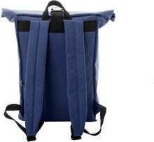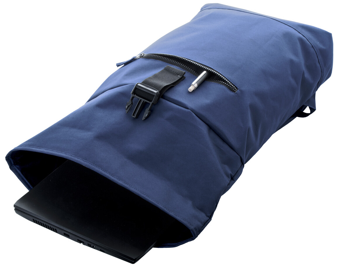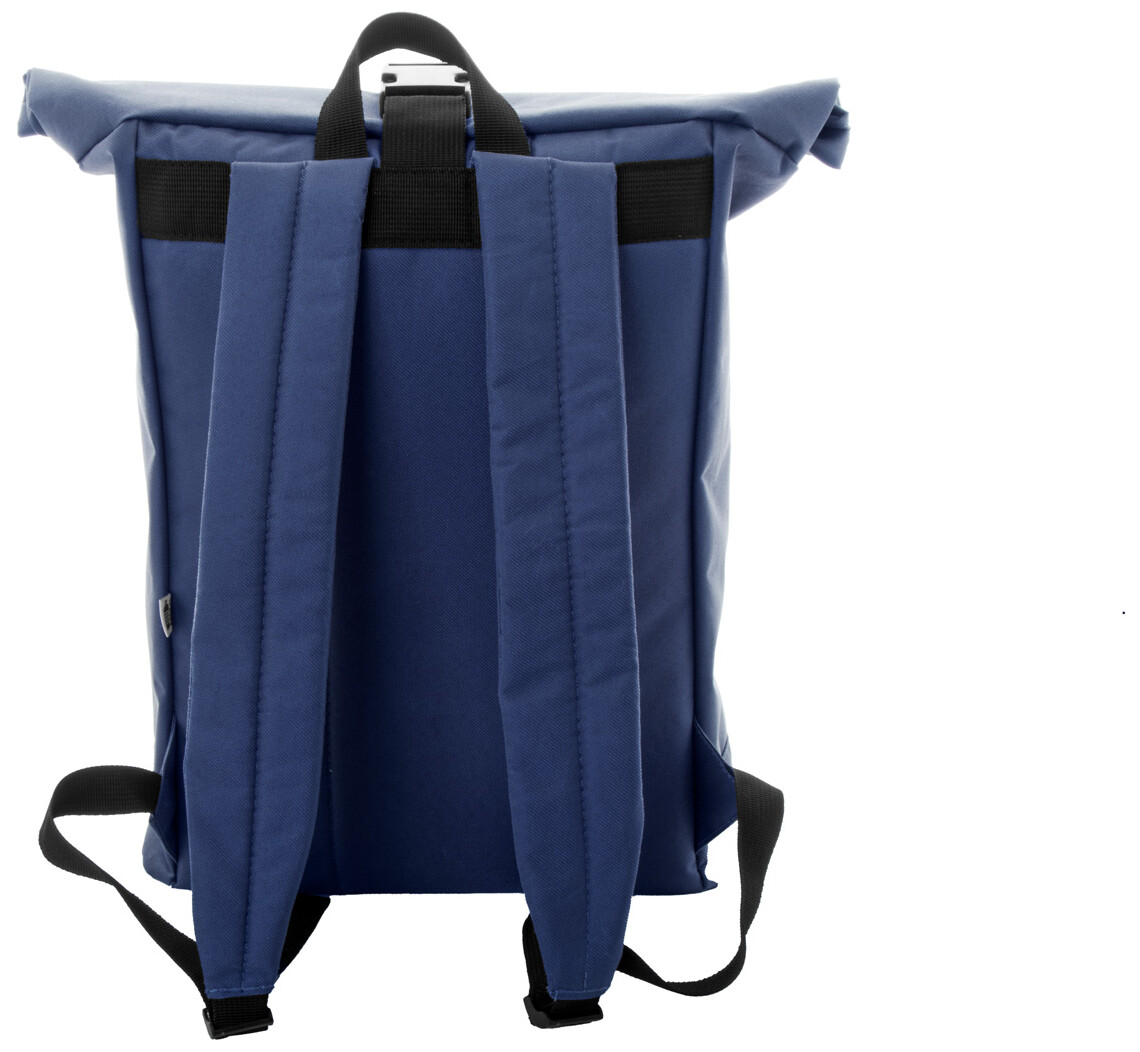 Rolovací batoh RPET se zapínáním na přezku, přední kapsa na zip, polstrovaná přihrádka na notebook (15"), polstrovaná záda a ramenní popruhy. Polyester 600D RPET s výrazným štítkem RPET.