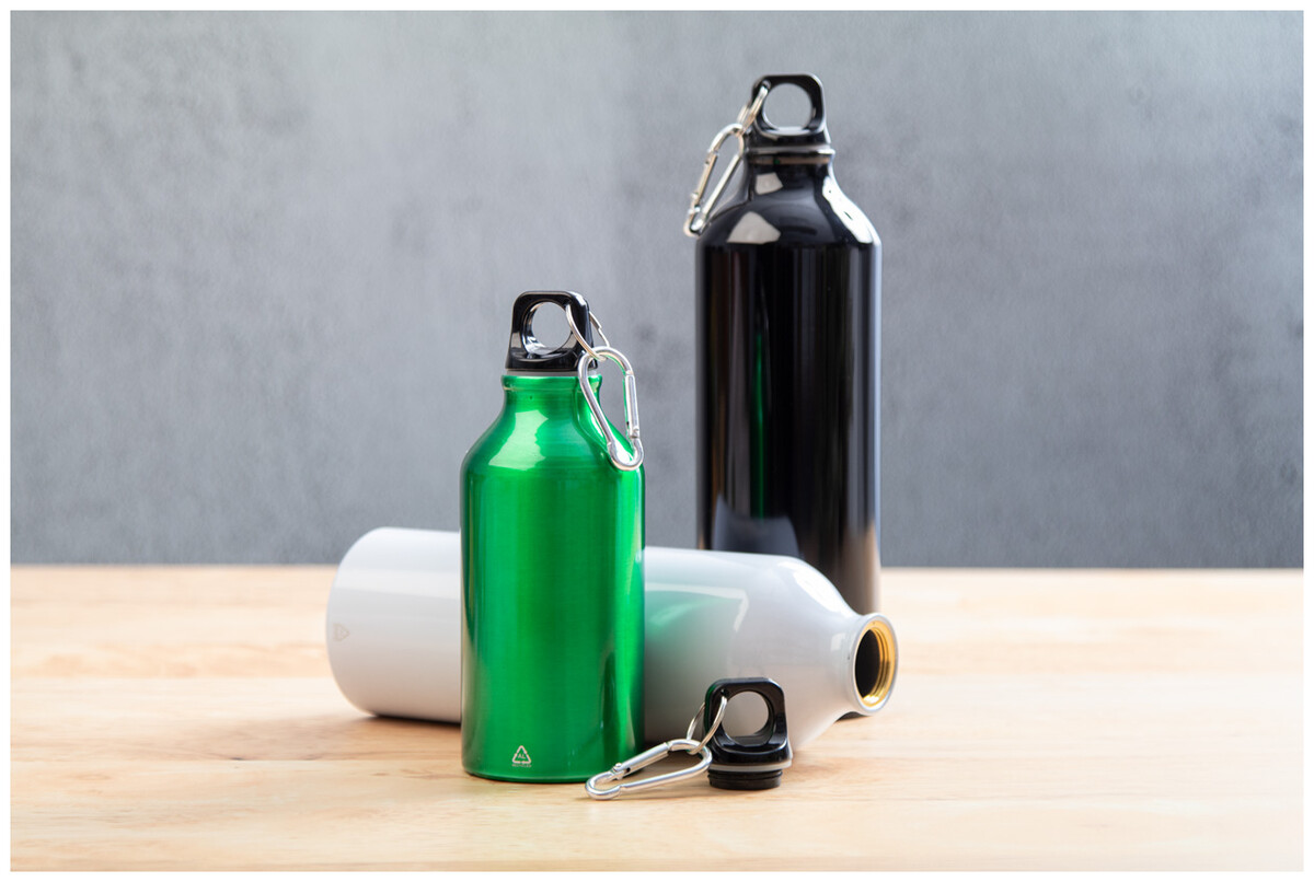 Láhev z recyklovaného hliníku s karabinou z recyklovaného hliníku, 750 ml.