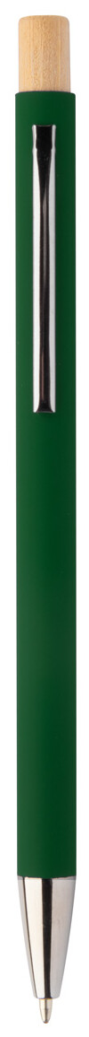 Kuličkové pero z recyklovaného hliníku s pogumovaným povrchem a bambusovým tlačítkem a chromovými detaily. Se speciální vrstvou pro zrcadlové laserové gravírování. S modrou náplní.