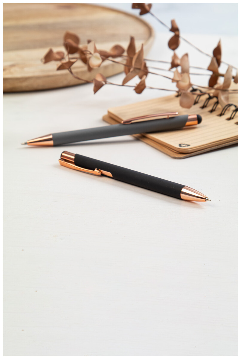 Kuličkové pero z recyklovaného hliníku s pogumovaným povrchem a detaily v barvě růžového zlata. Se speciální povrchovou úpravou pro zrcadlové laserové gravírování v barvě růžového zlata. S modrou náplní.