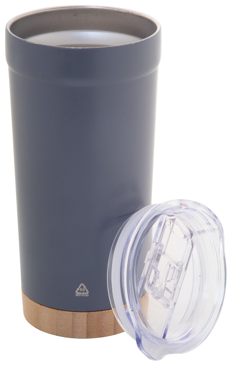 Dvoustěnný vakuově izolovaný termo hrnek z recyklované nerezové oceli s bambusovým dnem a AS plastovým víčkem na pití. 600 ml.