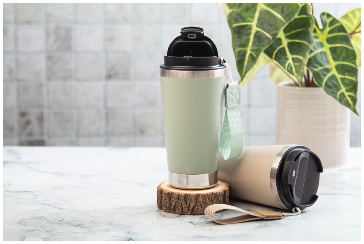 Dvoustěnný termo hrnek z recyklované nerezové oceli s víčkem na pití z PP a páskem na přenášení v odpovídající barvě. 430 ml.