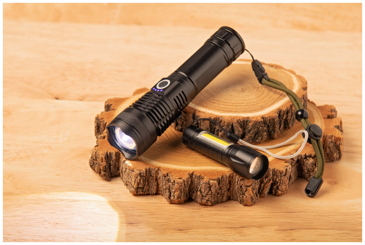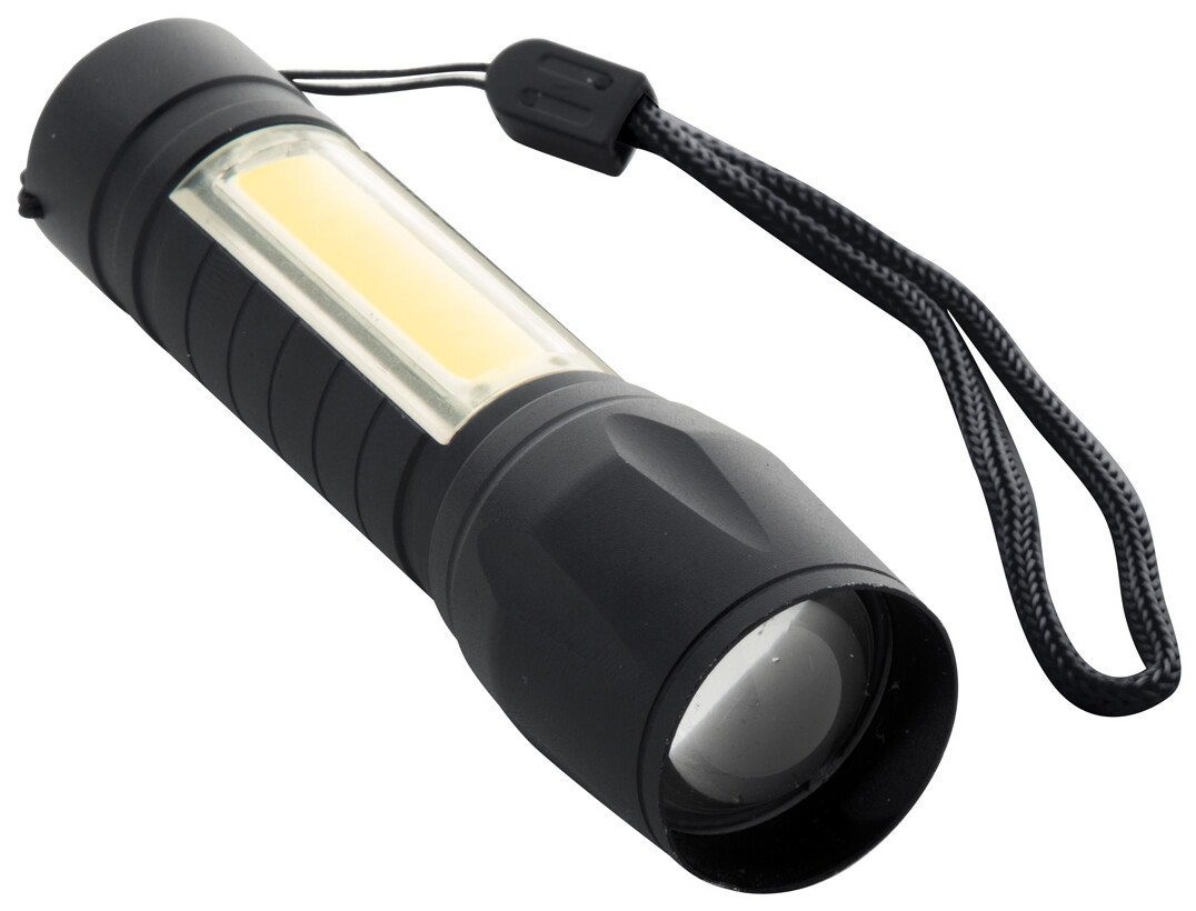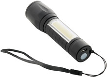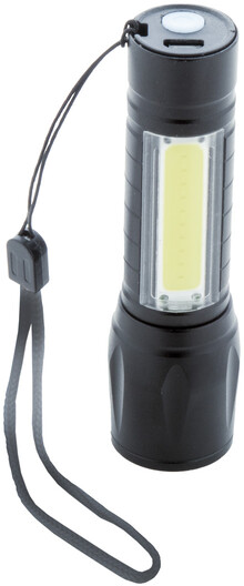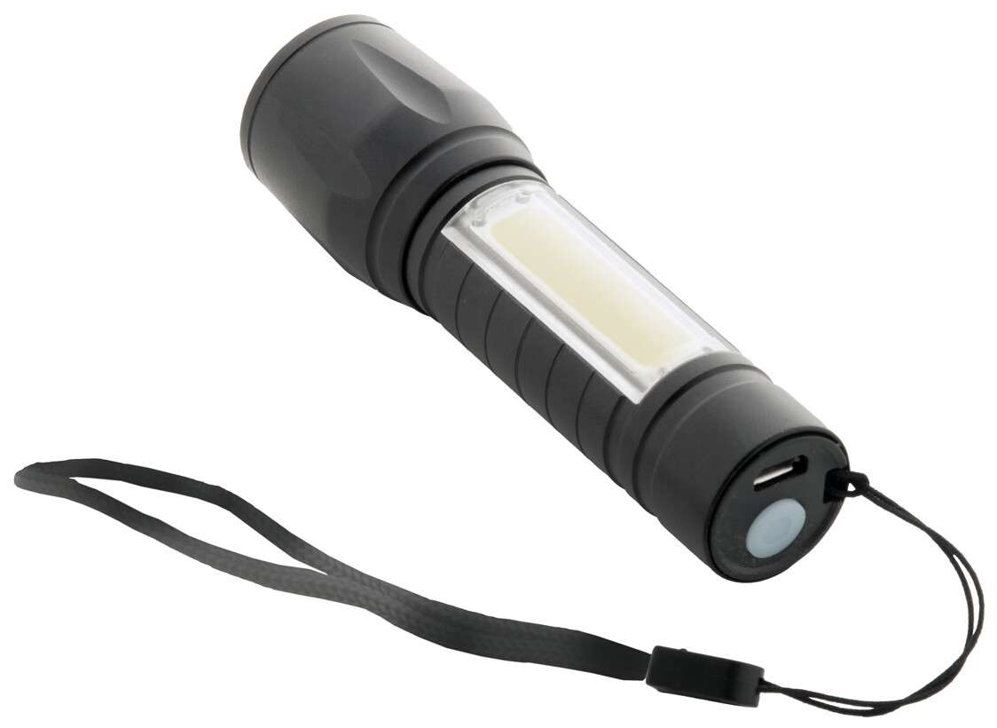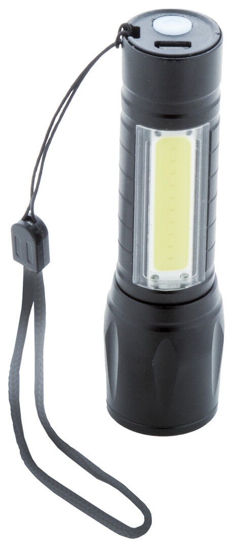 Hliníková baterka s vestavěnou USB dobíjecí baterií (400 mAh) a popruhem na přenášení. Se zoomovatelným vysoce výkonným COB světlem u písma a COB světlometem na boku. S pevným a blikajícím režimem světla. Včetně USB nabíjecího kabelu.
