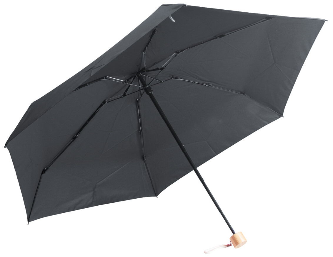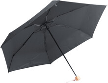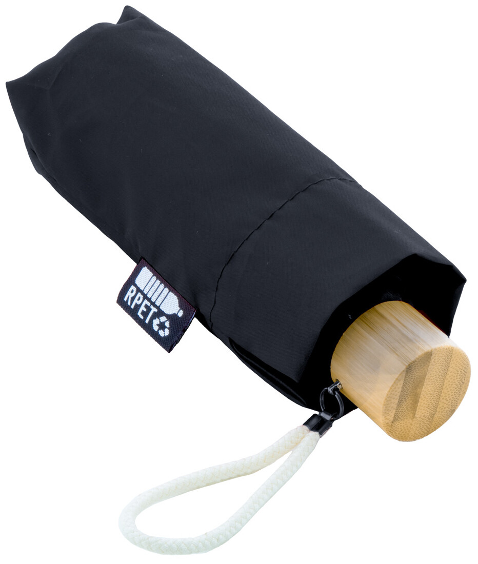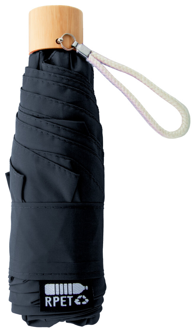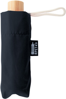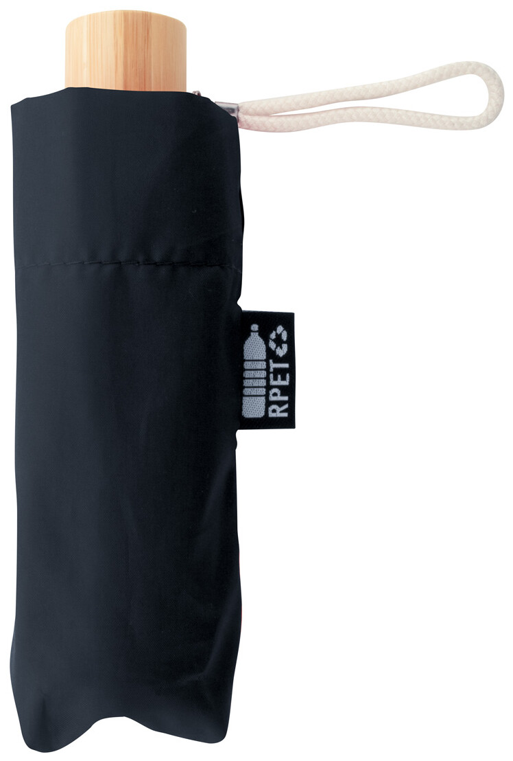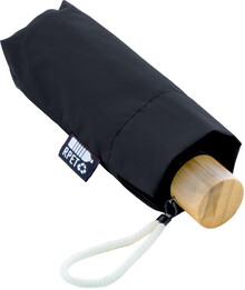Manuální, větruodolný 3-skládací mini deštník s 6 panely v pouzdru v odpovídající barvě. S kovovým rámem, sklolaminátovými žebry, bambusovou rukojetí a bavlněným poutkem na ruku. 190T RPET pongee, s výrazným štítkem RPET.