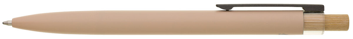 Béžová designová kovová propiska z recyklovaného hliníku. Tmavý kovový klip je uchycen v ozdobné transparentní koncovce, doplněné bambusovým cvakátkem. Náplň velkoobsahová, modře píšící. Kolekce SAVE THE NATURE.