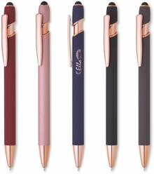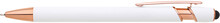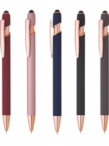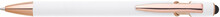 Kovová propiska s bílým soft povrchem, touch koncovkou a doplňky v růžovo-zlaté barvě. Laserované logo je lesklé, růžovo-zlaté. Náplň modře píšící.