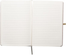 Zápisník A5 v deskách potažených béžovou látkou z recyklované bavlny má 80 linkovaných listů. Blok má uzavírací gumičku, poutko na propisku a textilní záložku v přírodní barvě.