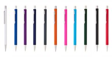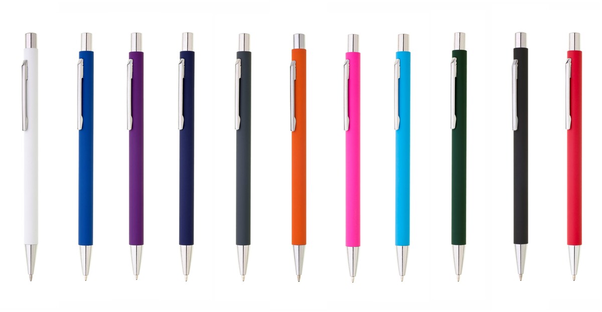 Tenká, jednoduchá propiska s modrým pogumovaným tělem a chromovými doplňky. Náplň X20, modře píšící.