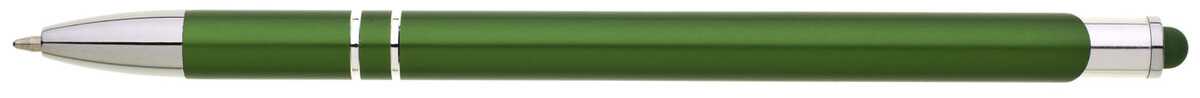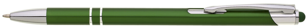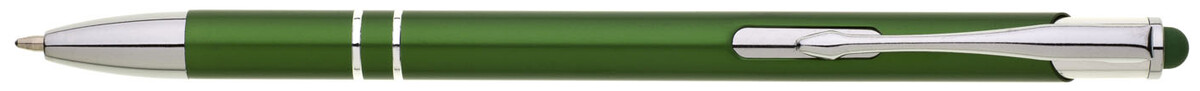 Tenká zelená hliníková propiska s chromovými doplňky a touchem v barvě těla. Náplň X20 modře píšící.