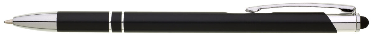 Tenká černá hliníková propiska s chromovými doplňky a touchem v barvě těla. Náplň X20 modře píšící.