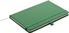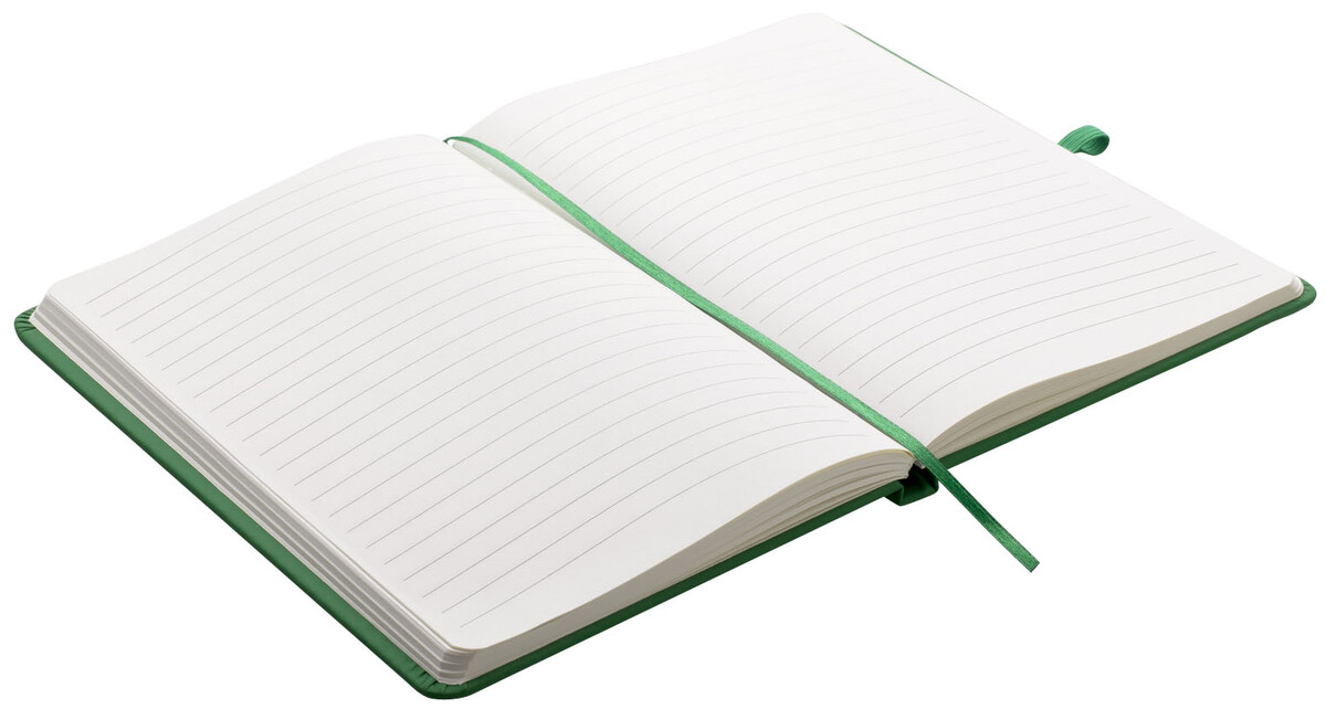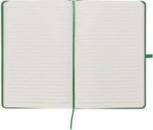 Zápisník A5 v zelených deskách z PU materiálu má 80 linkovaných listů. Blok má uzavírací gumičku, poutko na propisku a textilní záložku v barvě desek.