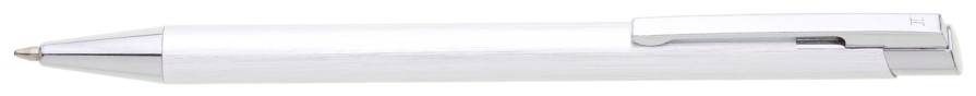 Stříbrná kovová propiska s jemně rýhovaným povrchem.
