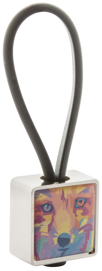Čtvercový přívěšek na klíče s černým gumovým poutkem s epoxy potiskem.