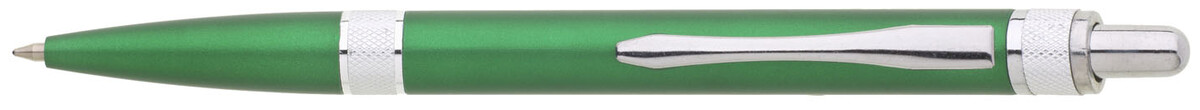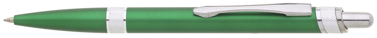 Plastová propiska s metalickým zeleným povrchem a chromovými ozdobnými detaily. Velkoobsahová, modře píšící náplň.