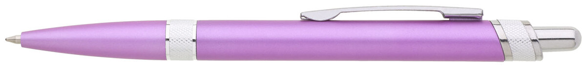 Plastová propiska s metalickým růžovým povrchem a chromovými ozdobnými detaily. Velkoobsahová, modře píšící náplň.
