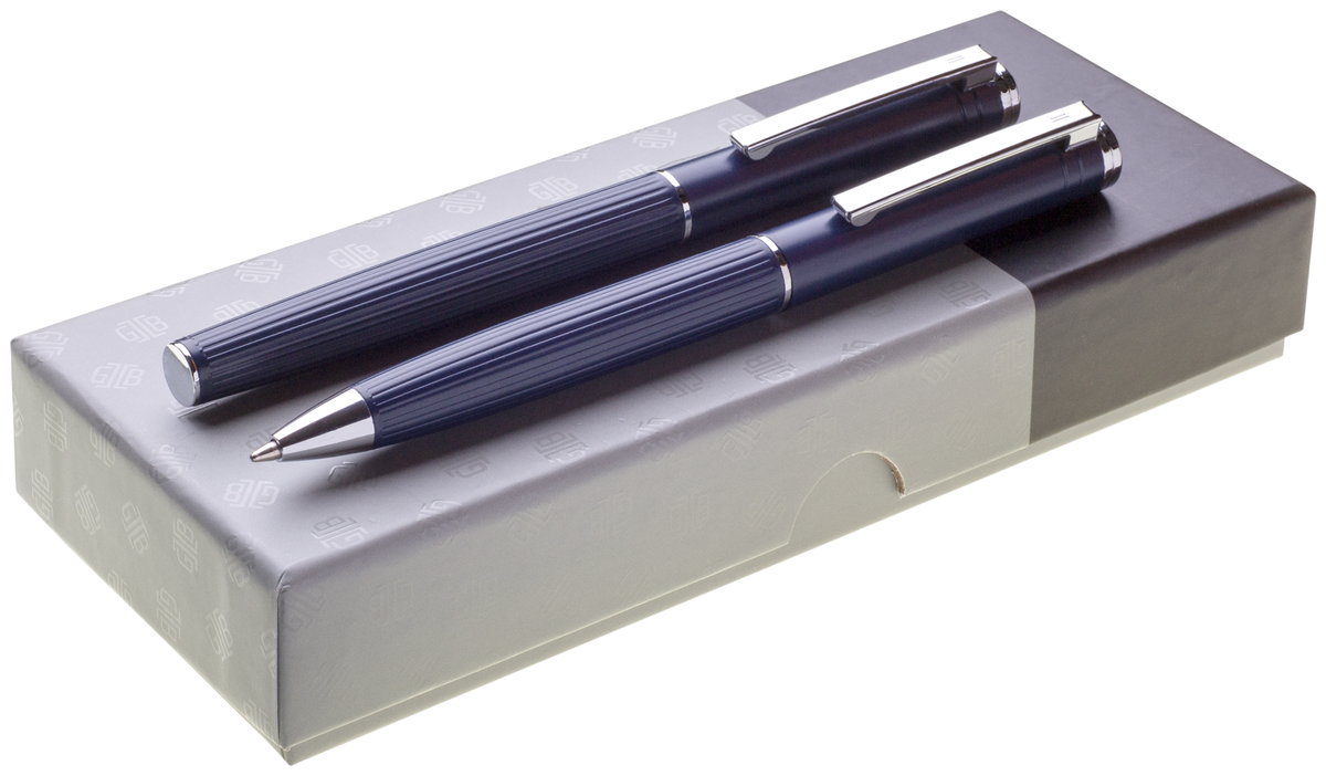 Dárková sada s tmavě modrou propiskou a rollerem v dárkové papírové krabičce. Laser na propiskách je lesklý stříbrný. Kolekce GB.