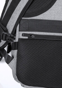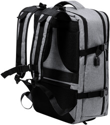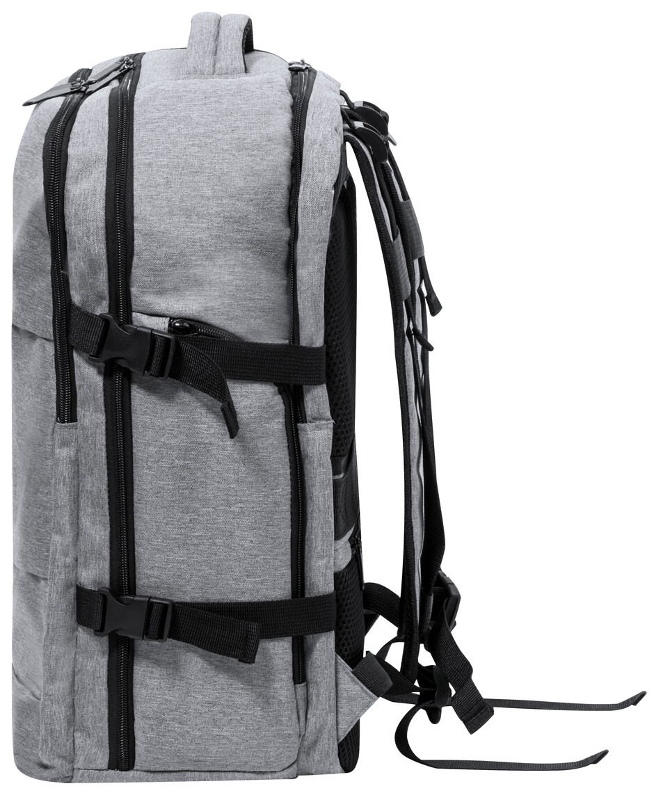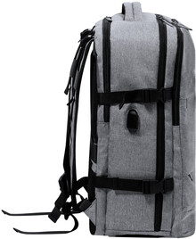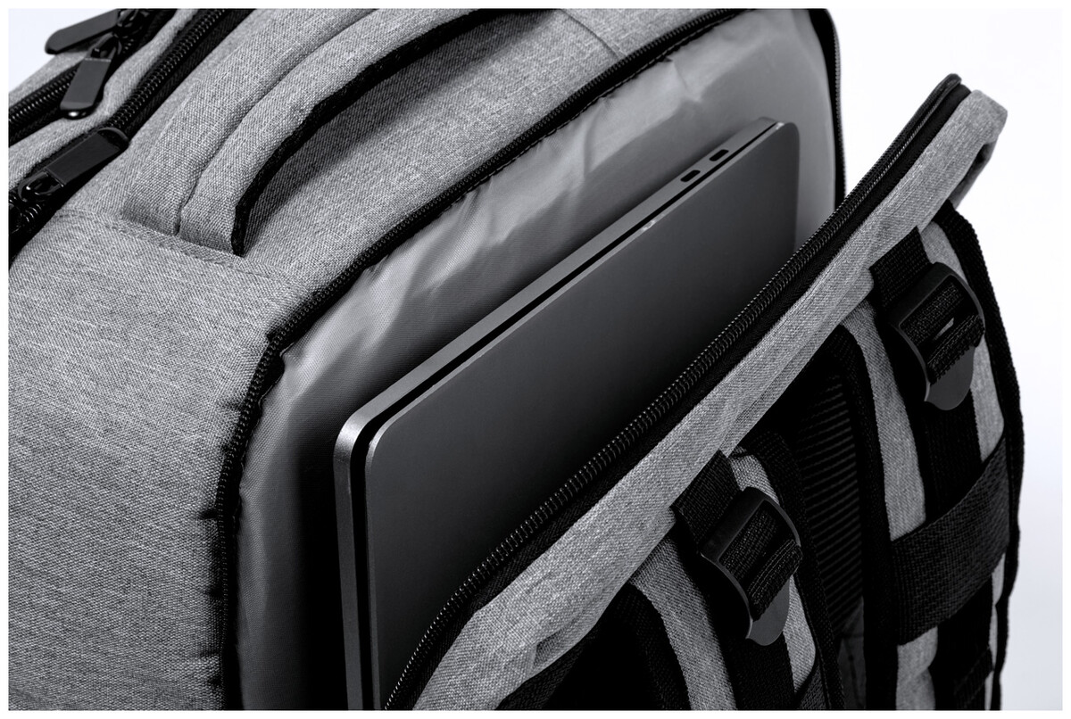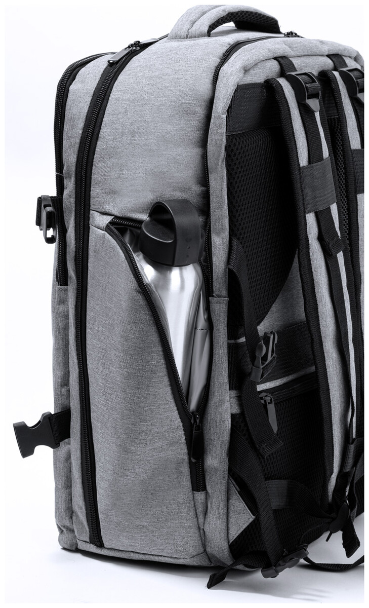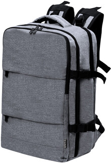 Voděodolný RPET batoh se 3 hlavními přihrádkami na zip, 2 předními kapsami na zip, boční kapsou na zip a skrytou kapsou proti krádeži. S polstrovanými přihrádkami na notebook (17") a botami, polstrovanými zády a ramenními popruhy. S popruhem na vozík a vestavěným USB připojením pro powerbanky. Polyester 300D RPET s výrazným štítkem RPET.